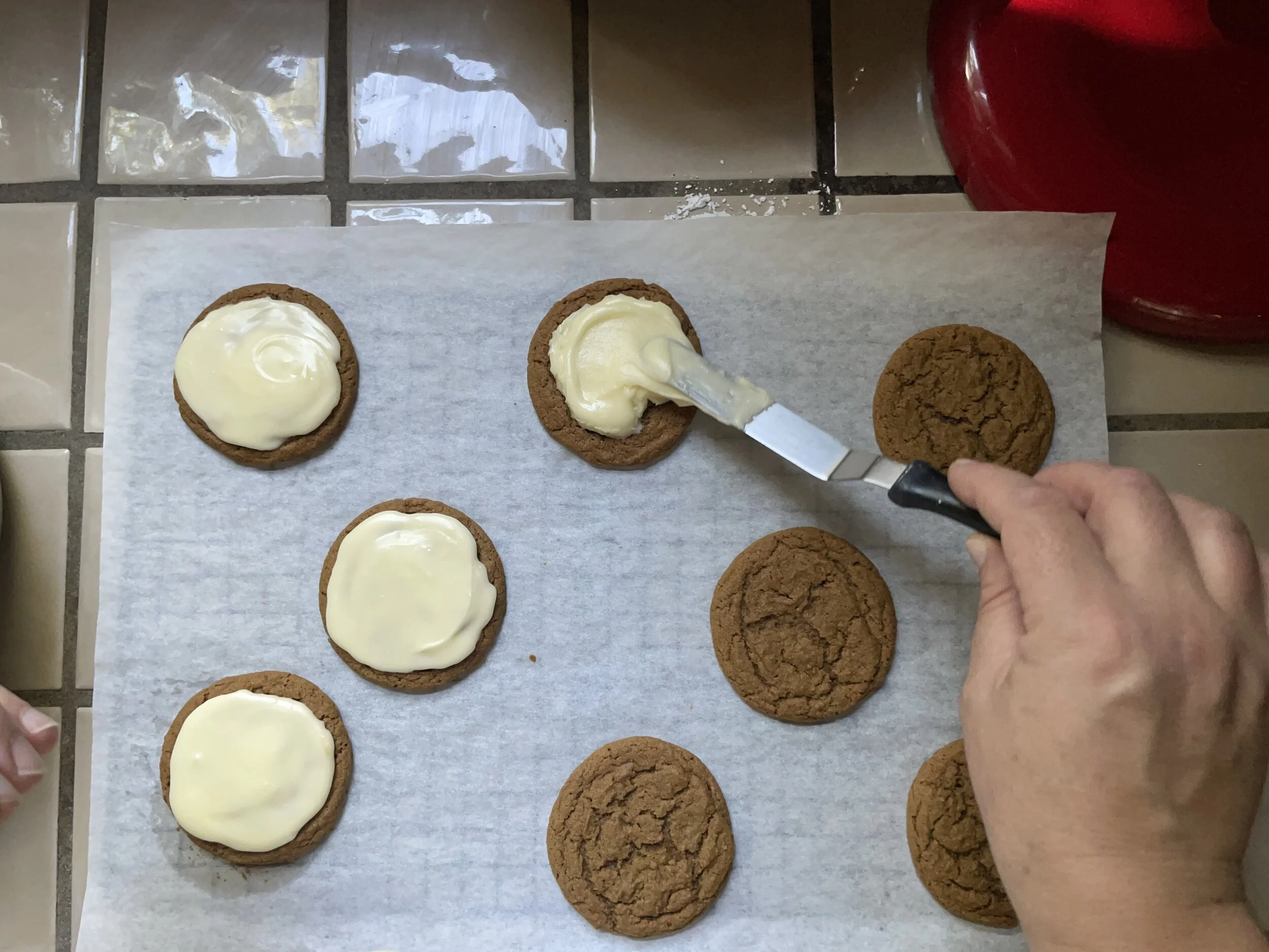 To frost the cookies, mound about a spoonful of frosting in the center of a cookie and use a small offset spatula to smooth the frosting outward in circle. Let the frosting set.