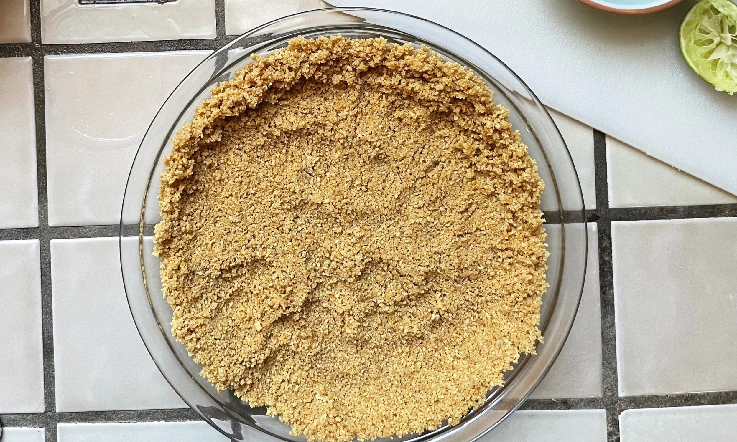 Press the crumbs evenly into the bottom and up the sides of the pie plate. You can use the bottom of a measuring cup for more even pressure.